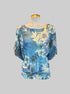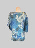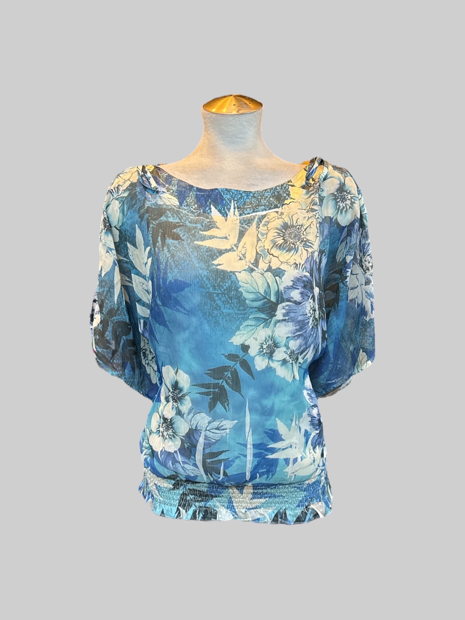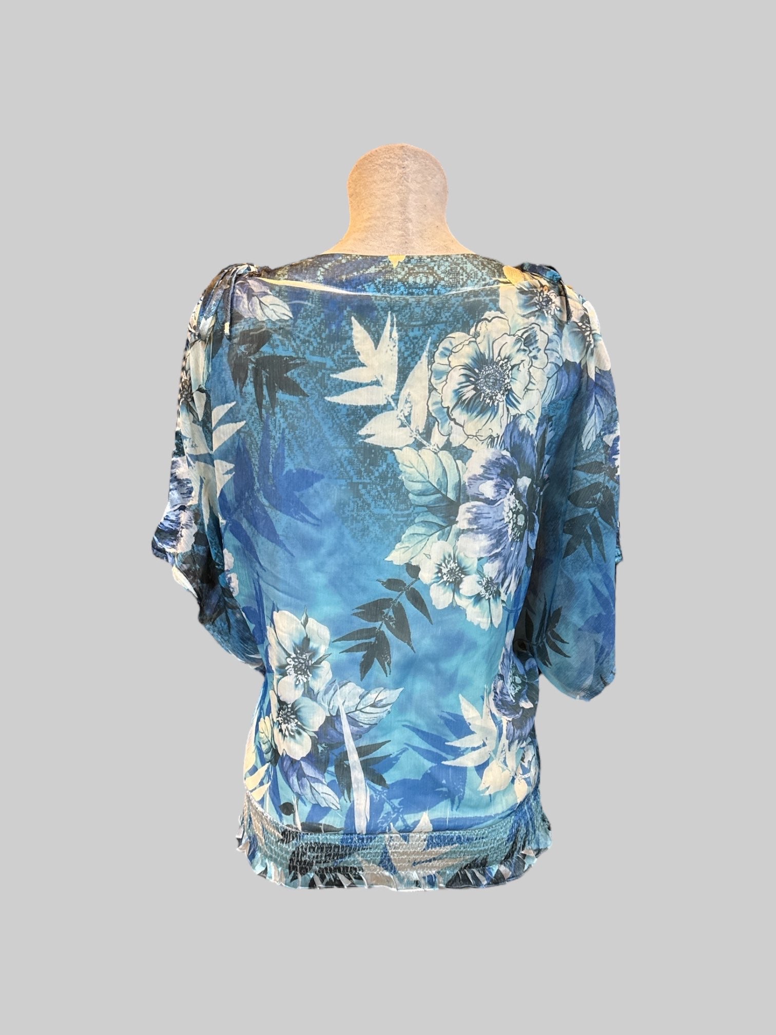 XL blue and white floral top with sheer layer, cold shoulders with ties, and shirred waist