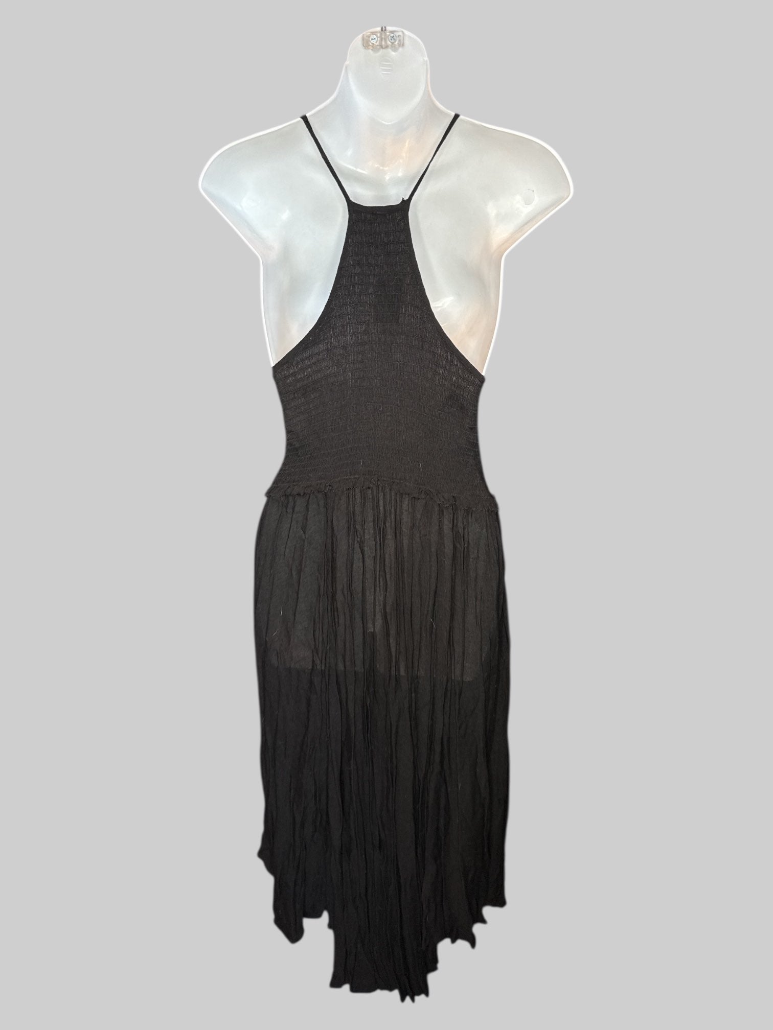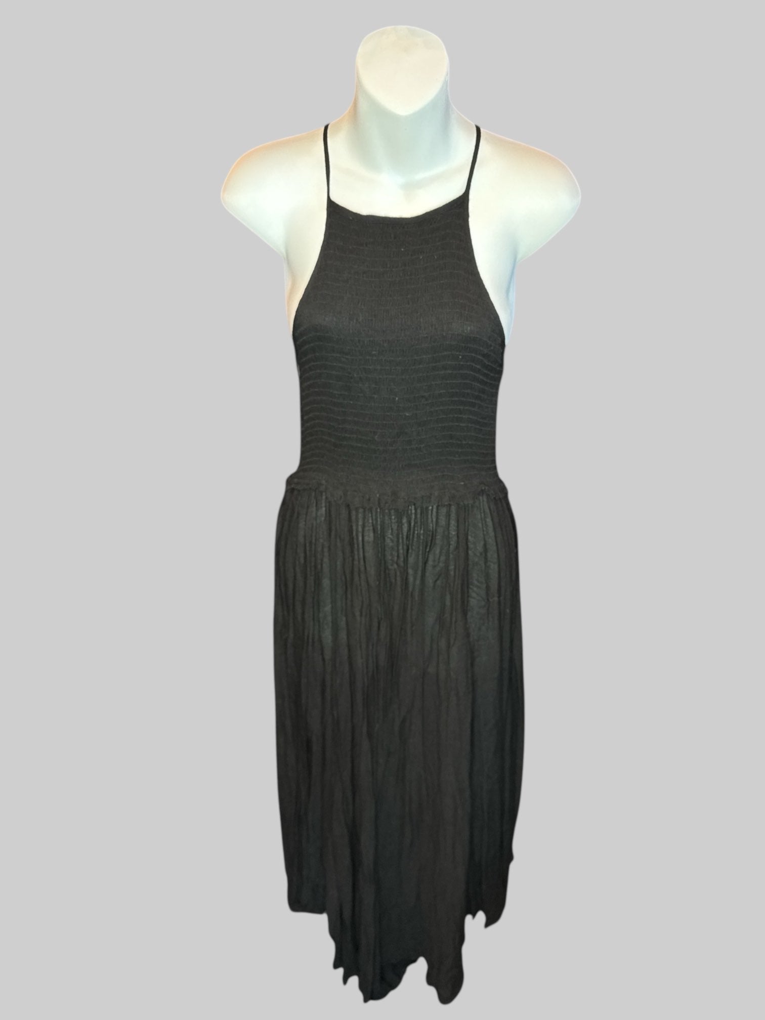 XS Black sleeveless dress with flowy bottom, and shirred top